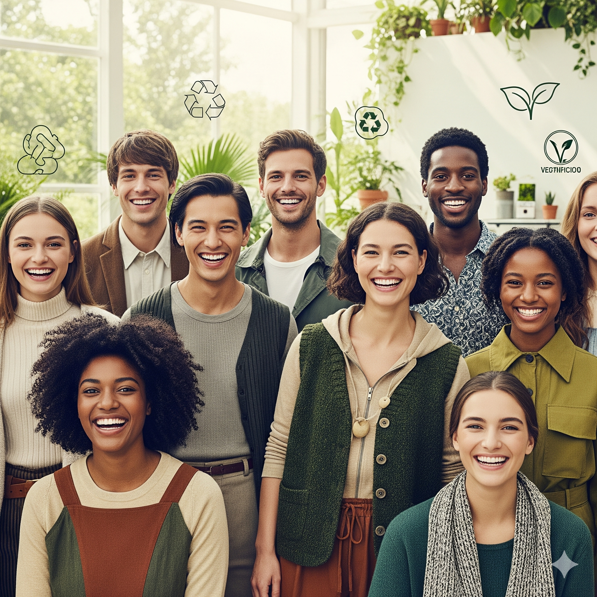 다양한 인종의 남녀 모델들이 지속 가능한 소재로 만들어진 의류 착용하고 활짝 웃고 있다. 배경은 자연 친화적인 공간
